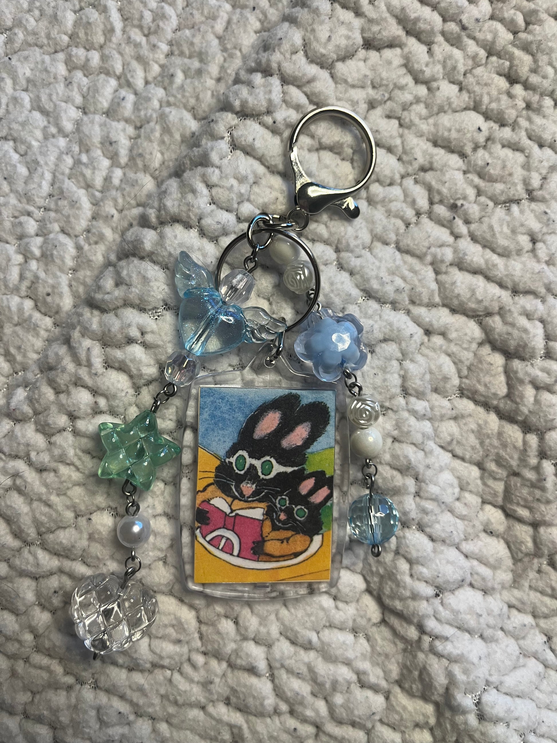 Made with ~ Blue, Green and Clear acrylic charms, as well as an acrylic photo key chain with a cut out of a thrifted book. This one is from Read To Your Bunny Book. I also use Silver colored zinc snap hook, this one has a larger round one. Sterling steel jewelry wire, and sterling silver jump rings.