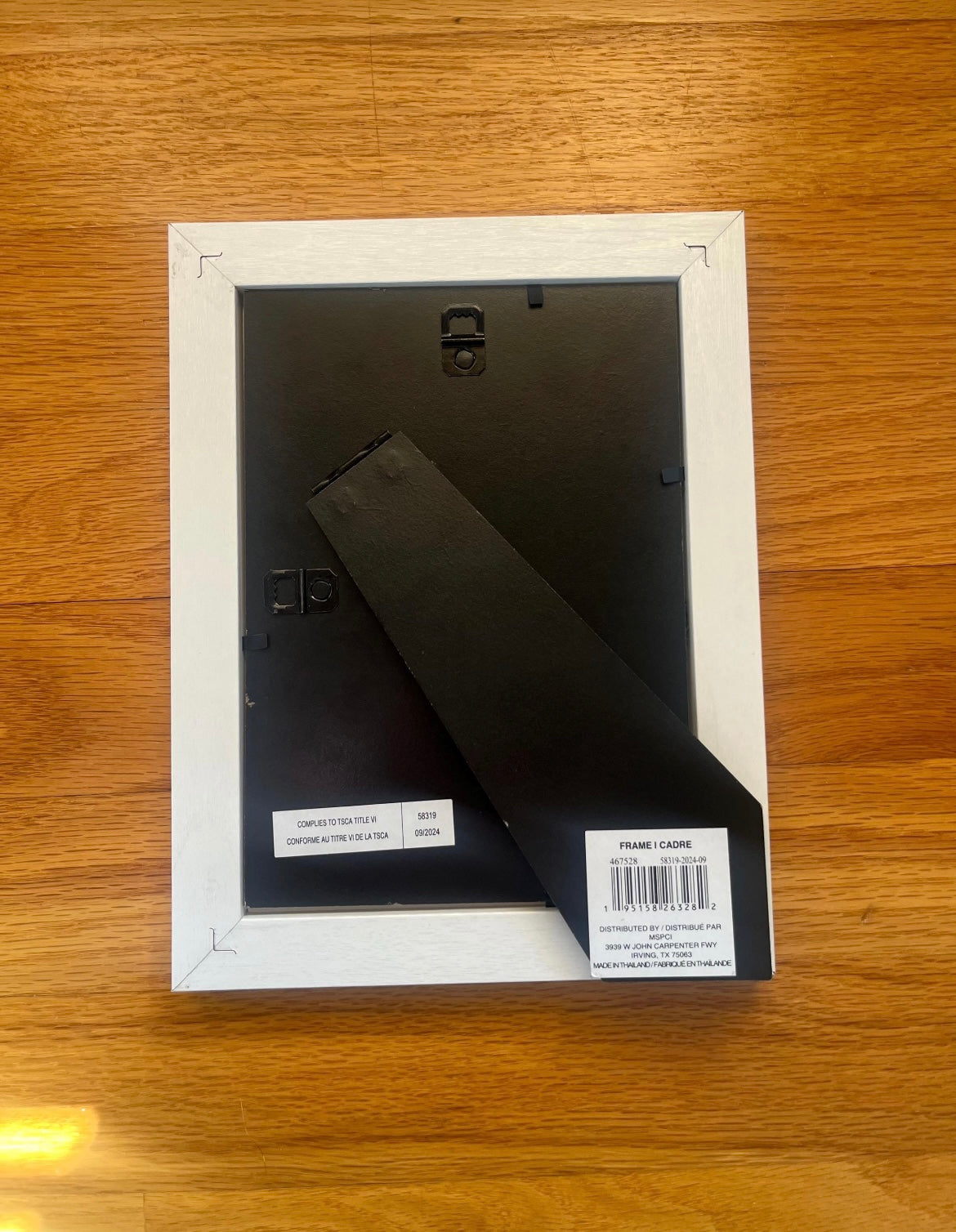 The frame is 5x7 but the art it self is smaller within the frame 4x6. Also to keep the art steady it’s glued onto the backboard of the frame.
