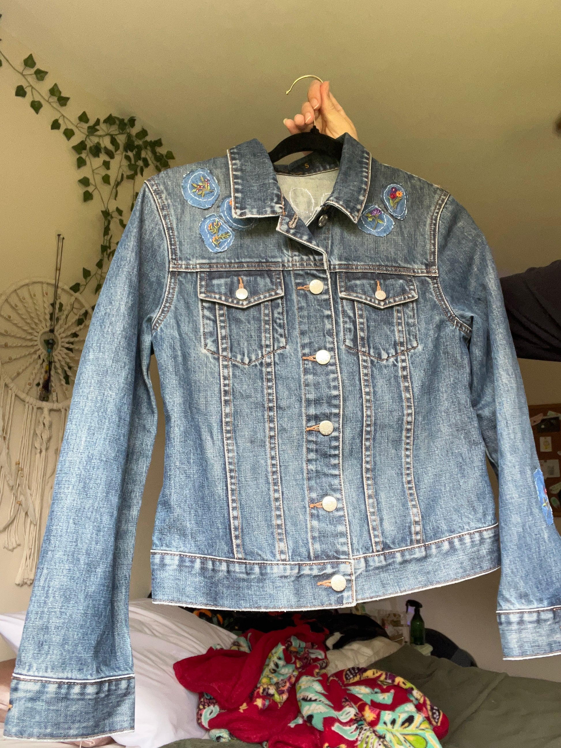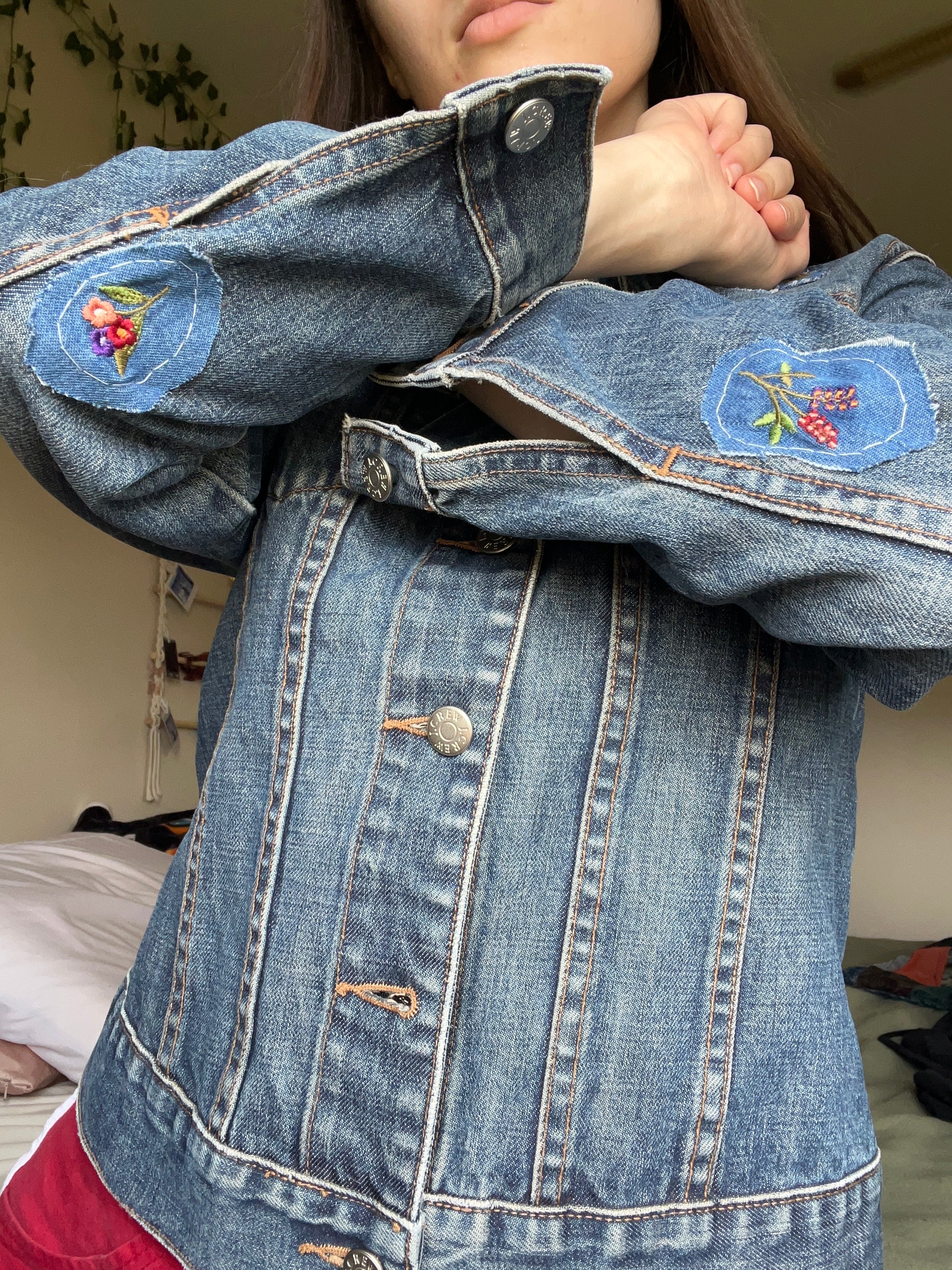 My first sewing project and it was truly so soothing. I chopped up a shirt from the 90s with flower embroidery and sewed them onto this jacket as patches! I also glued using fittdyhe cause I’m paranoid and need them to stay forever.