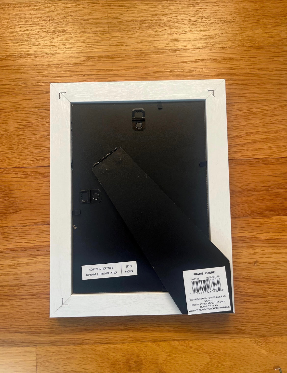 The frame is 5x7 but the art it self is smaller within the frame 4x6. This product can be hung up or used as a table top piece. Also to keep the art steady it’s glued to the backboard of the frame.