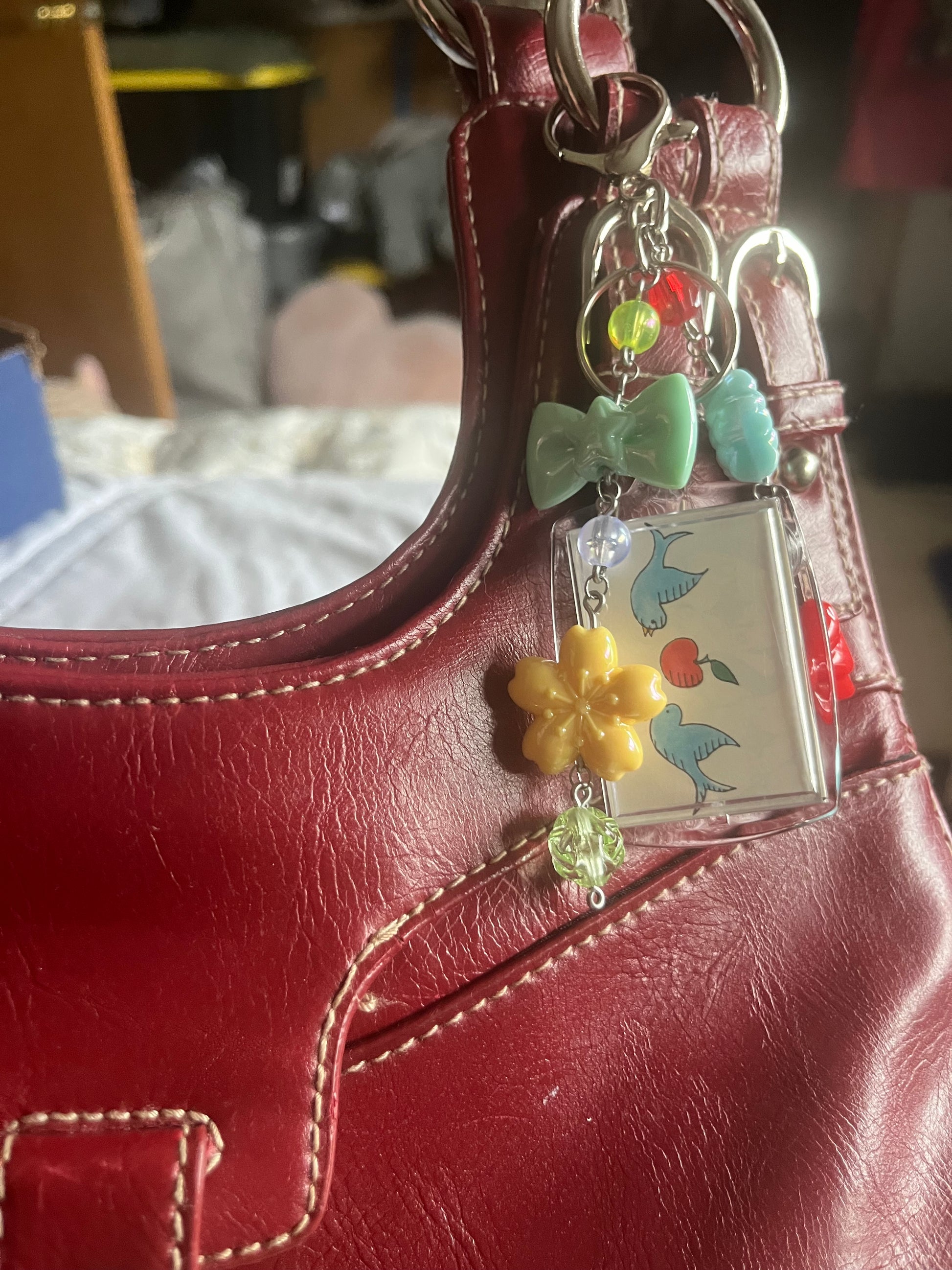 Made with ~ Green, Blue, Yellow and Red acrylic charms, as well as an acrylic photo key chain with a cut out of a thrifted book. This one is from Enchanted Gates. I also use Silver colored zinc snap hook, this one has a larger round one. Sterling steel jewelry wire, and sterling silver jump rings.