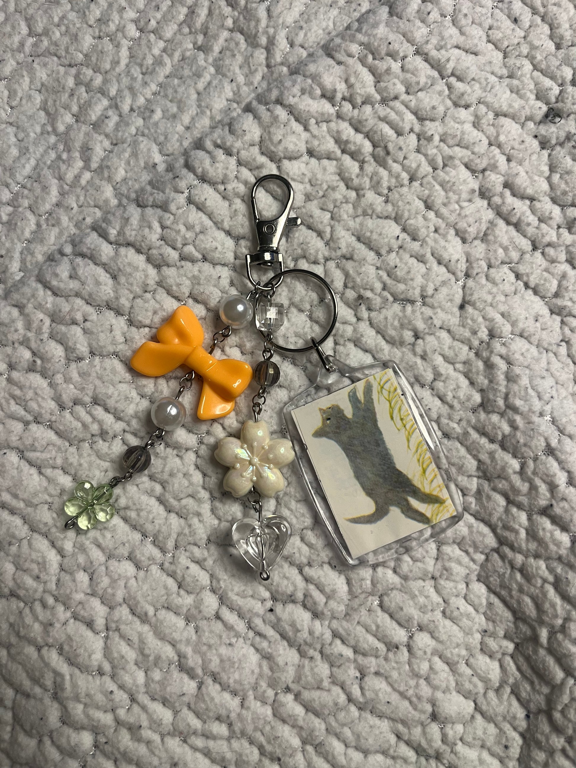 Made with ~ Green, Orange, Clear acrylic charms, as well as an acrylic photo key chain with a cut out of a thrifted book. This one is from Enchanted Gates. I also use Silver colored zinc snap hook, this one has a larger round one. Sterling steel jewelry wire, and sterling silver jump rings.